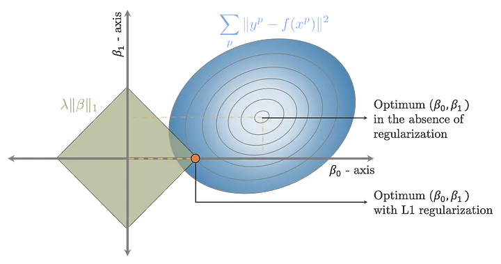 L1 노름을 활용한 가중치 감쇠는 녹색 다이아몬드 내부에 있는 손실 함수(파란색)의 손실이 최소인 지점을 찾는 것을 의미합니다. 이는 L2 노름과 다르게 가중치 파라미터들의 값이 희소(Sparse)하도록 제한된다는 의미입니다. 벡터가 희소(Sparse)하다는 의미는 많은 가중치 값이 0이 되도록 유도한다는 의미이고, 모델이 중요한 특징만을 선택하고 나머지 특징을 무시하도록 도와준다는 의미입니다. 따라서, L1 정규화는 가중치를 희소하게 만들어 모델의 해석성을 높일 수 있습니다.