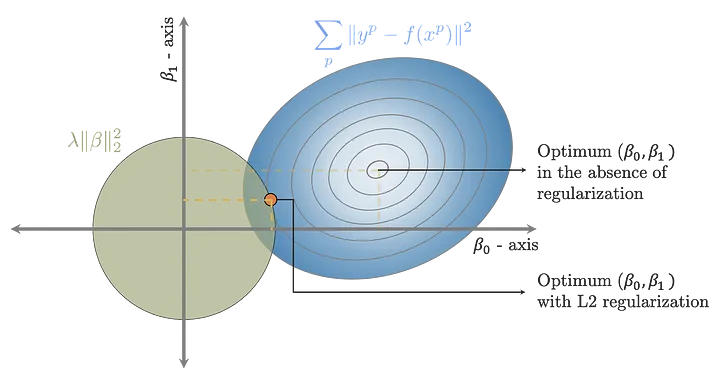 - 그림으로 표현하면 L2 정규화는 L2 원(녹색원) 내부에 있는 기존의 최적화 함수(파란색)에서 손실이 최소인 지점을 찾는 것을 의미